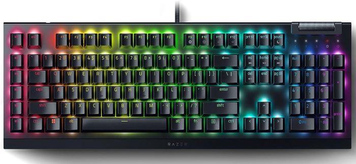 - Teclado: Opta por un teclado mecánico para una respuesta táctil y una experiencia de escritura más cómoda. Ejemplo de un teclado mecánico de calidad es el Razer BlackWidow V4 X, con 6 teclas macro dedicadas, tecnología Razer Chroma RGB y teclas de ABS de doble inyección para resistir el uso intenso.